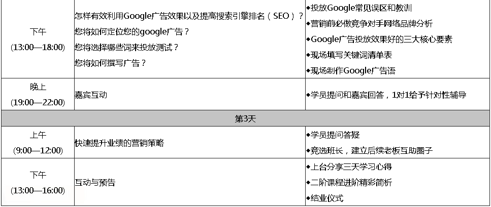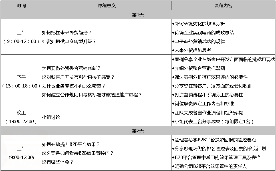 3-4個月的互動式咨詢,我們會帶著學(xué)員,輔助其一步步落地,讓學(xué)員不僅“學(xué)到”、“悟到”,最重要的是“做到 2. 對象聚焦,課程只針對外貿(mào)老板 我們講的是營銷管理方面的課程,此課程只適合外貿(mào)老板。 3. 嚴(yán)格篩選制度,確保課程品質(zhì) 為了保證課程的高品質(zhì)及內(nèi)容的有效性,對于分享嘉賓我們也有著嚴(yán)格的篩選制度。 |
