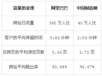 無論是客戶的平均停留時(shí)間、在網(wǎng)頁的平均瀏覽頁數(shù)、網(wǎng)站平均跳出率來看,阿里巴巴也優(yōu)于中國制造網(wǎng)。