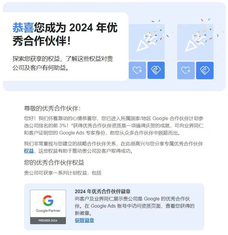 這次再次獲得谷歌2024年度的認(rèn)可,不僅證明了谷歌對第一頁業(yè)務(wù)的高度認(rèn)可,也意味著第一頁將繼續(xù)接收來自谷歌官方Google Ads領(lǐng)域最新的專業(yè)知識,以更好地為客戶提供服務(wù)。